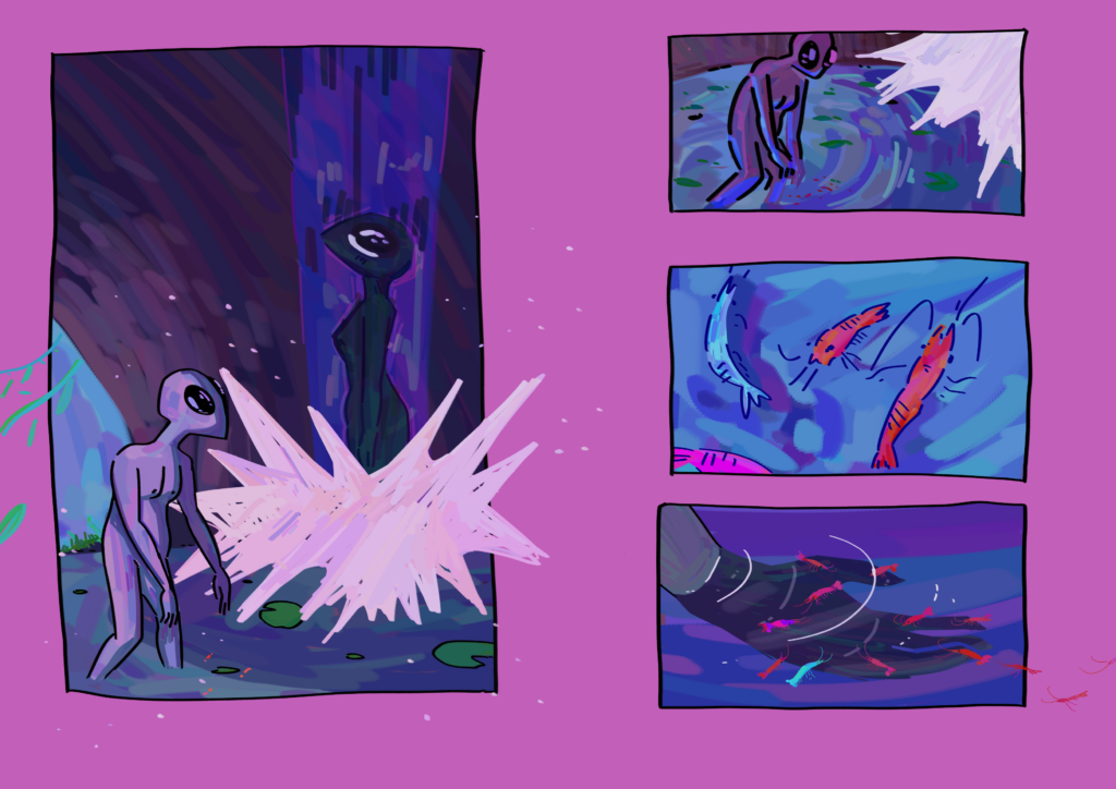 Two Aliens spend their first night on earth together. They have boobs and they love eachother a lot. 😀 Corn is involved. Bugs, and such. The beauty of life and nature!!!